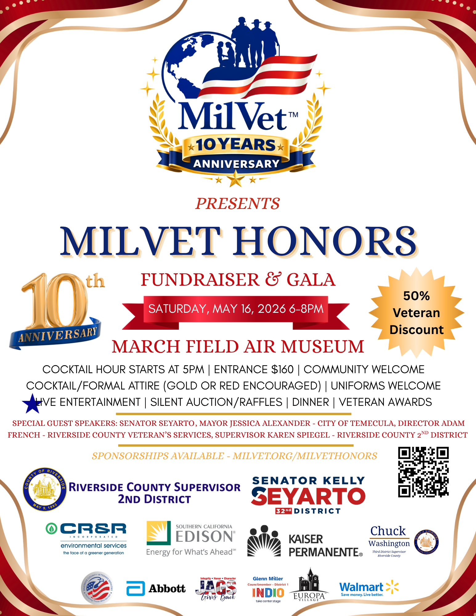 Register now for the Annual MilVet Honors Fundraiser at the March Field Air Museum! Enjoy an evening of Museum & Military Displays, live music, dinner, raffles, and veteran recognition for sacrifices and accomplishments. MilVet is celebrating our 10th year of giving back! Proceeds support deployed troops, veterans and their families.