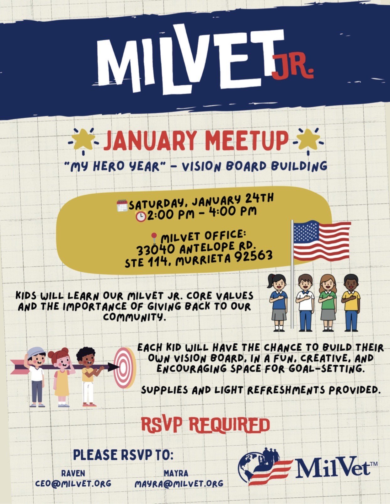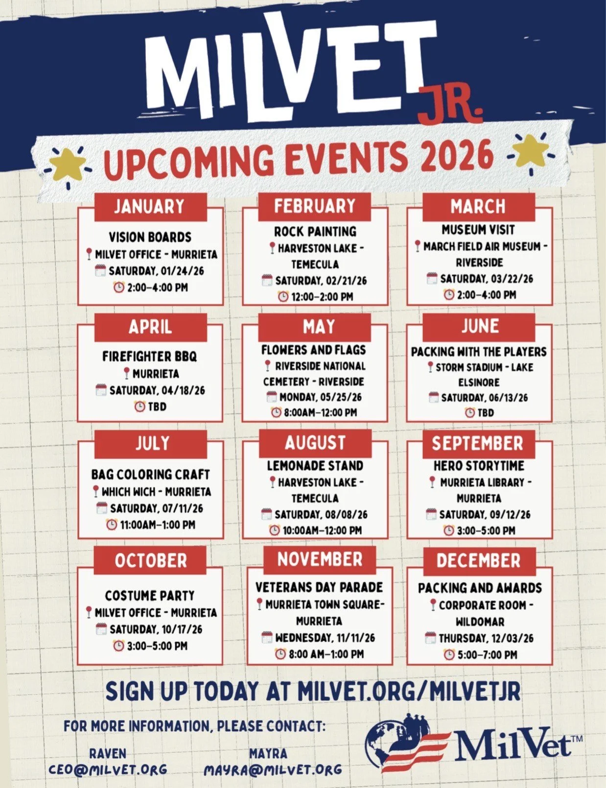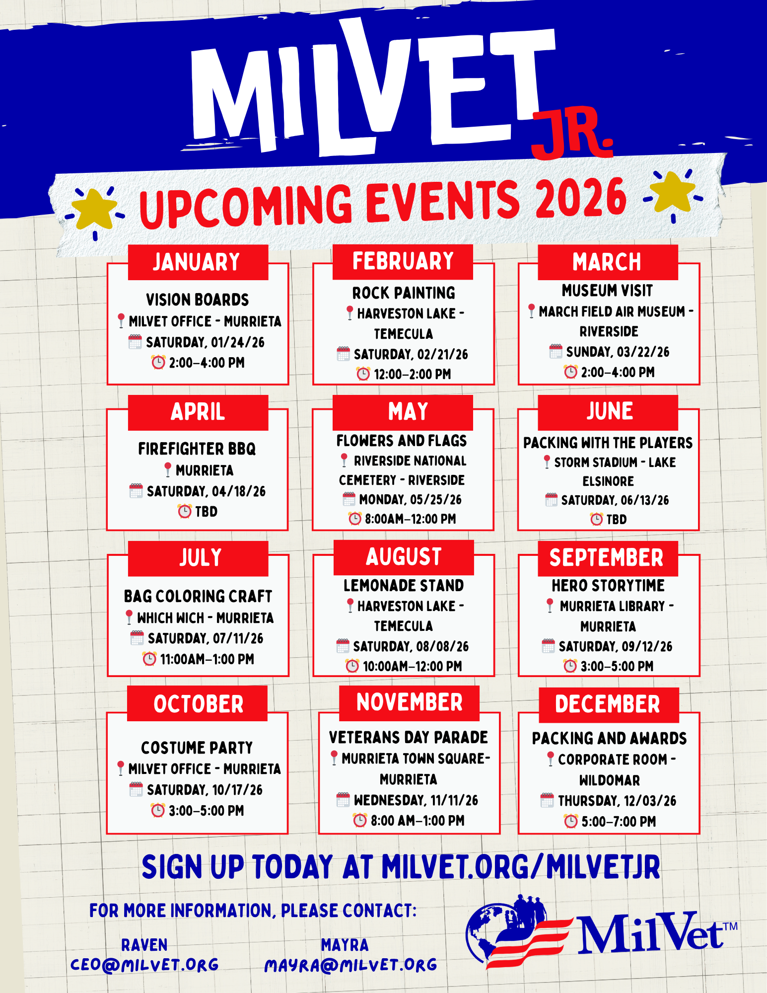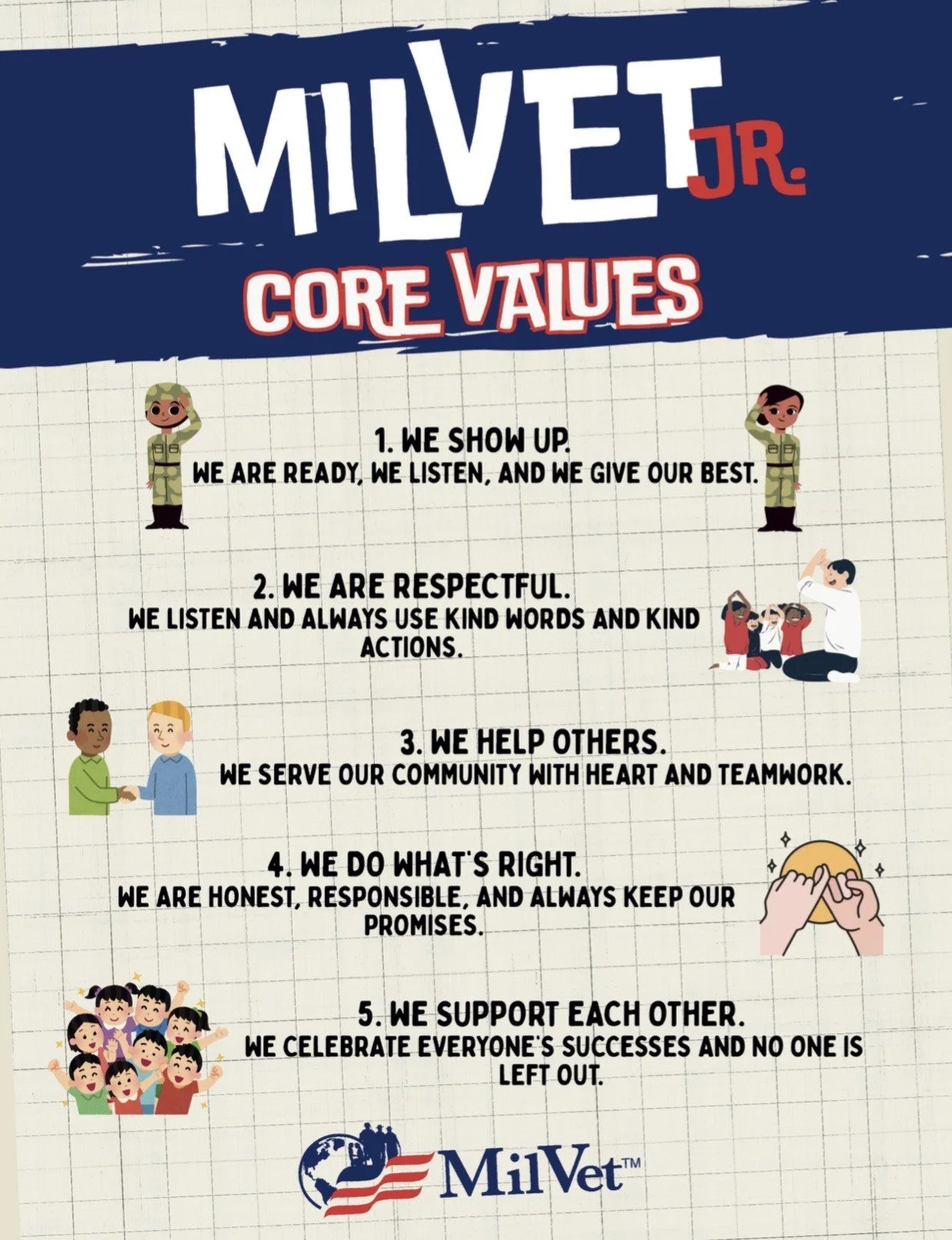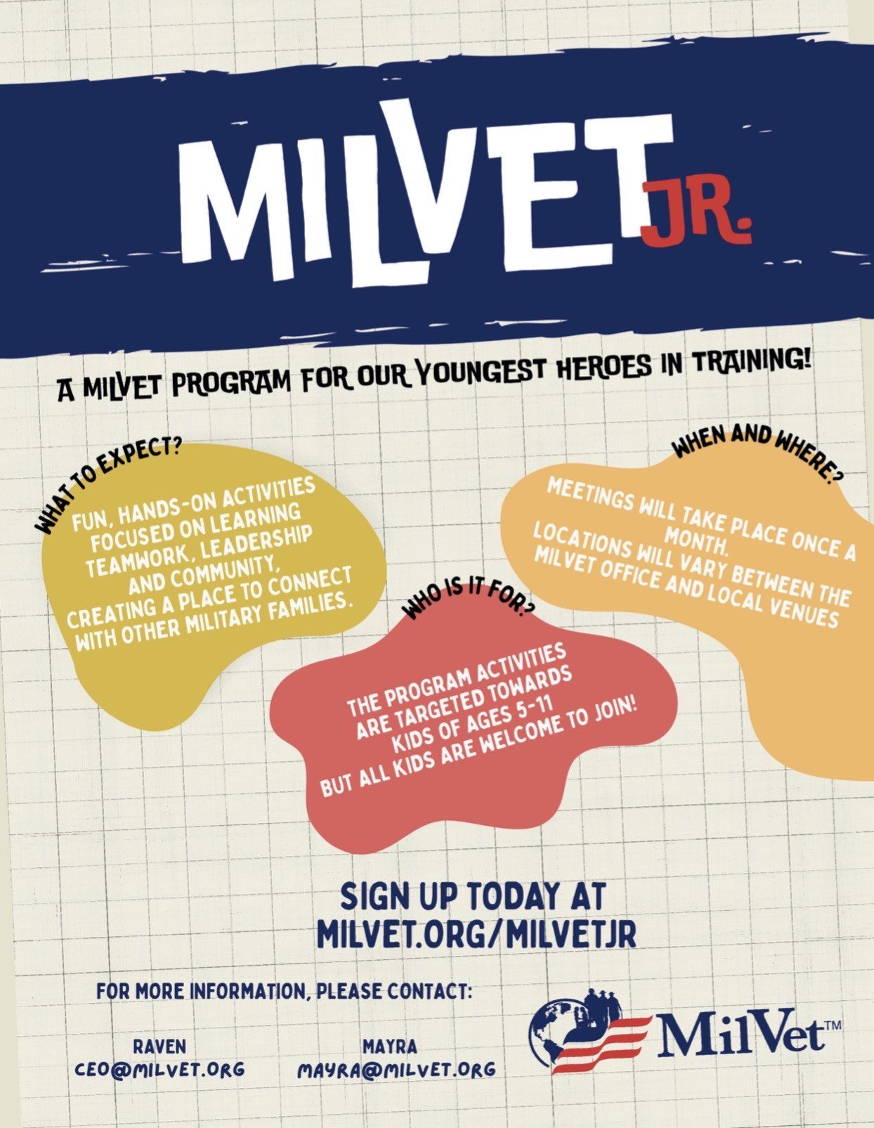 The MilVet Jr. Program is a year-round initiative that hopes to engage and inspire military-connected and community children through hands-on learning, service projects, and creative activities. To participate, families are asked to contribute a small donation fee of $50 at sign-up , which includes a MilVet Jr. t-shirt and a MilVet Jr. backpack for each child.