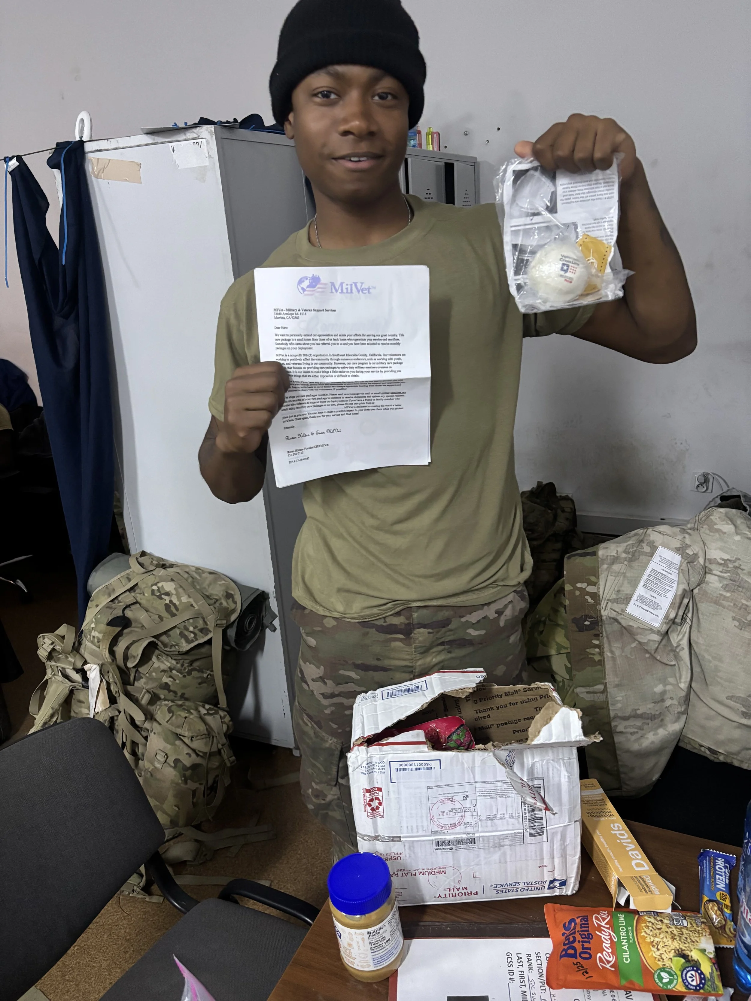 We greatly admire MilVet’s continued support of service members and your commitment to sending care packages that uplift morale and remind us of home. On behalf of our team, I’d like to respectfully request any support you may be able to offer through your care package program. Items such as snacks, protein powder, or coffee make a big difference during long stretches away from family and friends.